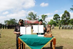 Penutupan TMMD ditandai dengan pemukulan gong serta penandatanganan naskah serah terima hasil TMMD dari Dansatgas TMMD kepada Pj Bupati Pati.