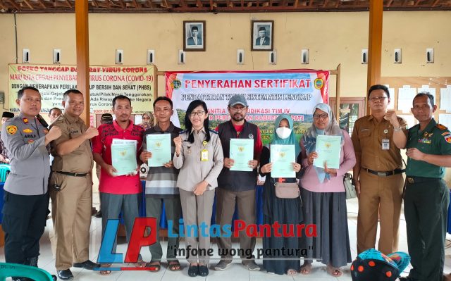 Pati, – Sebanyak 498 dari total keseluruhan 510 bidang sertifikat Program Pendaftaran Tanah Sistematis Lengkap (PTSL) tahun 2023 lalu hari ini diserahkan secara langsung oleh petugas dari BPN Pati kepada masyarakat pemohon sertifikat di Balai Desa Sendangrejo Kecamatan Tayu Pati, Senin (15/01/2024).