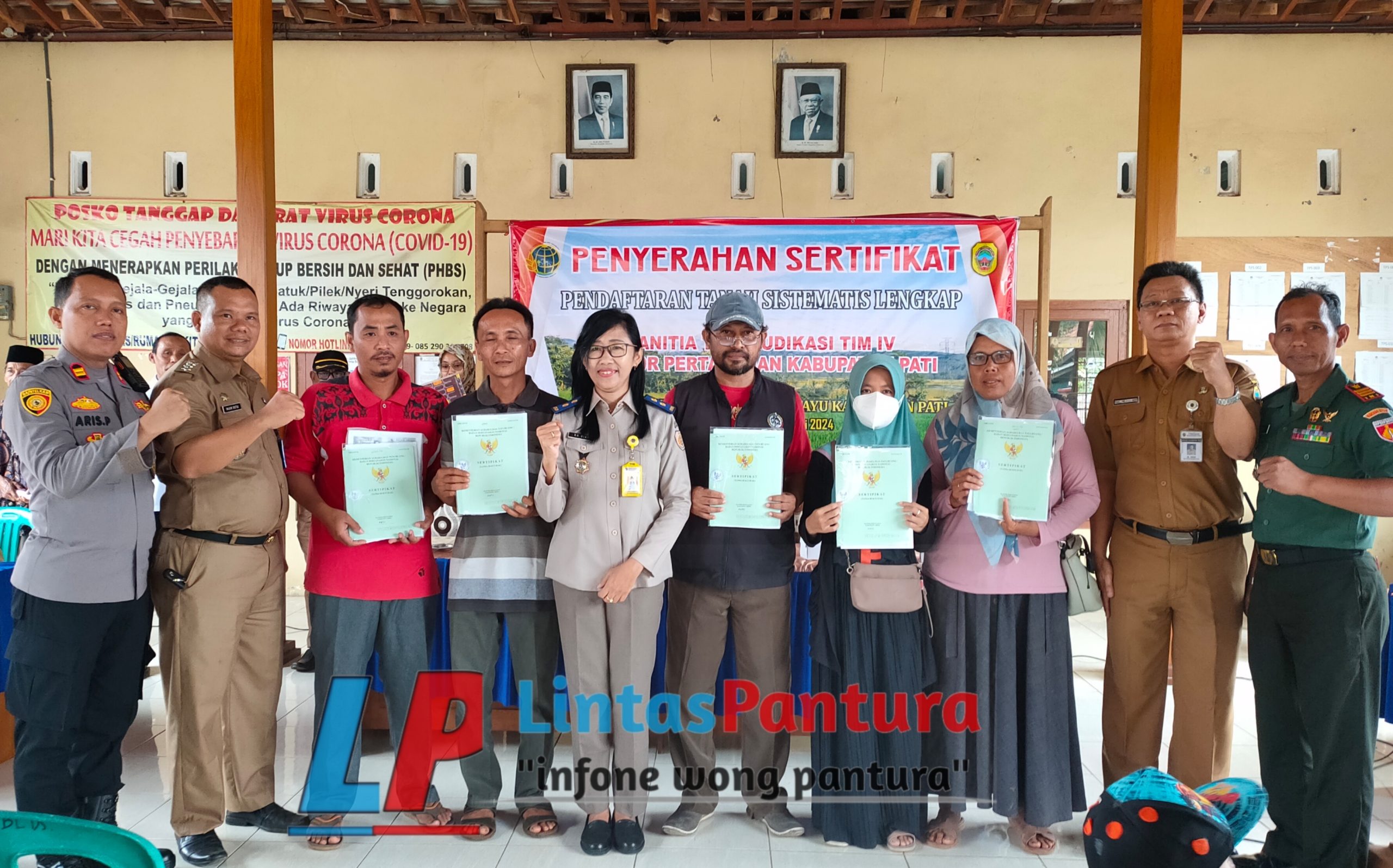 “Hari ini petugas dari BPN Pati menyerahkan Sertifikat PTSL secara langsung kepada maeyarakat sebanyak 498 dari 510 bidang, sedangkan 12 sertifikat lainya masih dalam revisi. Terkait beaya, kami sudah sesuai dengan SKB 3 menteri dan Peraturan Bupati yaitu 400 ribu rupiah dan tidak ada tambahan apapun”. jelas Adib.