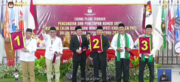 Pati, Lintaspantura.co.id – Komisi Pemilihan Umum (KPU) Kabupaten Pati hari ini senin (23/9/2024) melaksanakan pengundian nomor urut pasangan calon Bupati dan Wakil Bupati Pati masa periode 2024 – 2029.